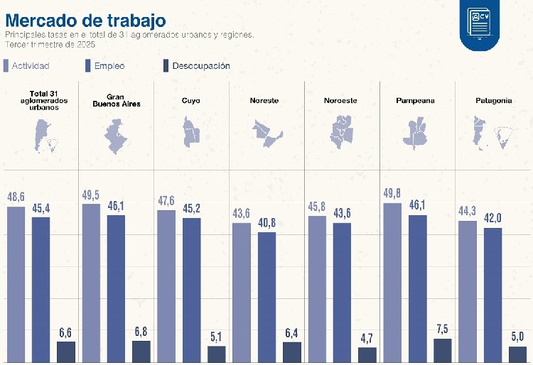 Al observar la dinámica por región, Gran Buenos Aires se ubicó en el primer lugar con 8,6% de desocupación, secundado por el área pampeana (7,7%), el Noreste (5,6%), Cuyo (4,9%), la Patagonia (4,8%) y el Noroeste (4,2%).