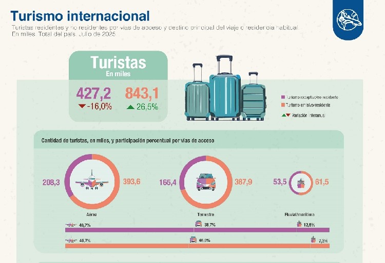 En julio de 2025 ingresaron 427,2 mil turistas internacionales a la Argentina y salieron 843,1 mil: 16% menos y 26,5% más interanual